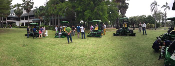 三天的培訓(xùn),時間安排緊湊有序,每天早晨七點準(zhǔn)時乘車出發(fā)去培訓(xùn)地點。前兩天培訓(xùn)安排在Lakewood高爾夫球場,最后一天的服務(wù)培訓(xùn)則安排在迪爾培訓(xùn)中心。首先從A系列最先進(jìn)技術(shù)Tech-control系統(tǒng)開始模擬操作學(xué)習(xí),通過顯示屏操控、設(shè)定、了解整車的運行、剪草、維修、診斷等功能。Tech-control可視界面,具備指尖控制功能,不僅有助于實現(xiàn)出色的剪草效果,還可提高機(jī)器的工作效率。然后我們分組圍繞機(jī)器,進(jìn)行最直觀的實機(jī)學(xué)習(xí)和討論,在輔導(dǎo)老師的提示下,識別并列出每款A(yù)系列機(jī)器的新增功能、改進(jìn)及變化之處。之后老師通過一張張機(jī)器部位卡片和實際部件,清晰明了地講解每個機(jī)型的每個改進(jìn)部位,不僅讓銷售人員們對機(jī)器的部件有更加清楚地認(rèn)知,而且對部件的位置、形狀和區(qū)別,都有了深刻的印象,值得我們學(xué)習(xí)借鑒。最后根據(jù)這兩天的學(xué)習(xí),每個人都親自上車實機(jī)演示,上車前設(shè)置好剪草、運輸、轉(zhuǎn)彎速度,手指輕按Tech-control操作平臺按鈕,即可感受自動巡航功能帶來的前所未有的操作員感受。通過課堂理論的學(xué)習(xí),以及室外場地的實機(jī)操作,使我們對A系列的新產(chǎn)品了解的更加透徹。在總結(jié)會上,老師準(zhǔn)備了很多A系列新功能的小標(biāo)題,通過游戲傳球的方式,讓大家利用小標(biāo)題展開話題進(jìn)行講解,課堂氣氛生動活潑,學(xué)員參與話題積極踴躍,而李國強對7200A在球場意外停機(jī)處理辦法的細(xì)致全面的講解,贏得了學(xué)員們熱烈的掌聲。