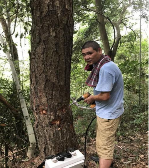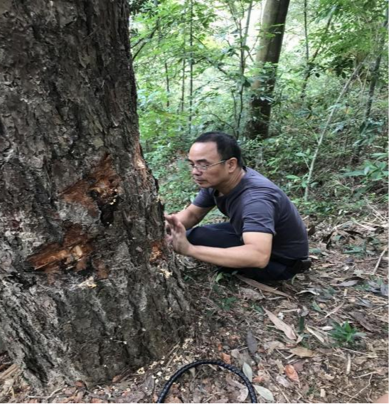 2022年9月8號,汪洋帶上綠友電動樹干打孔注藥機、木塞、藥品以及相應工具。早上五點鐘從廣州出發(fā),舟車勞頓數(shù)百公里,踏上拯救坪坑參天古樹的旅程。趕到潮州坪坑村,村委部文主任領路去村后的山上查看古松樹。在看過所有的古樹以后,根據(jù)松樹的枯葉癥狀,樹木呈現(xiàn)出來的病癥,最后診斷確認是松材線蟲危害所致。汪洋將診斷結果以及解決方案告知文主任,并通過電話向省林業(yè)部領導作匯報,得到批復后立即展開作業(yè)。
